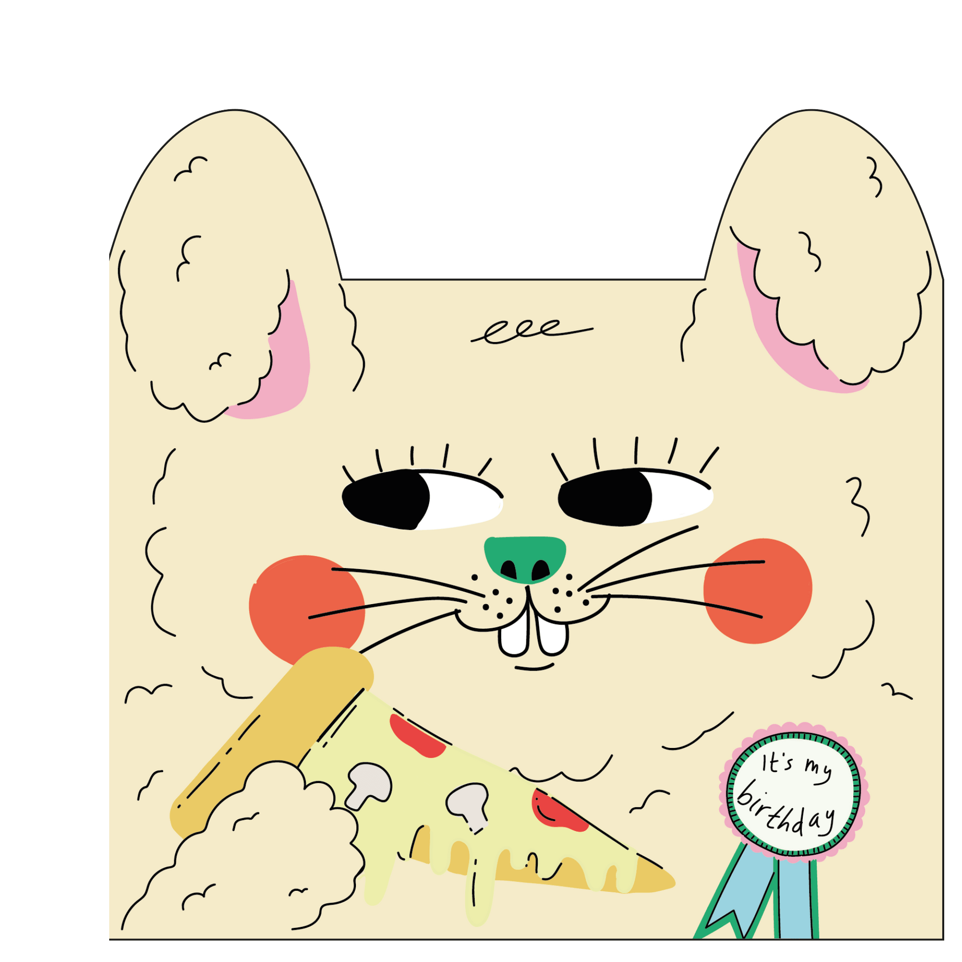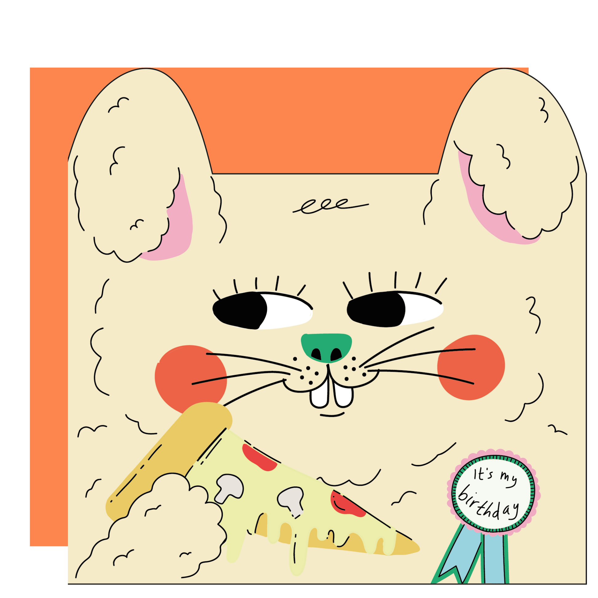 Rabbit eating pizza kids card is part of our new contemporary take on children’s greeting cards designed to stand out on the shelf and delight little ones. Each card stars a cheeky animal friend caught mid-snack — from a frog enjoying a scoop of fly-flavoured ice cream to a dog munching on crunchy hula hoops!