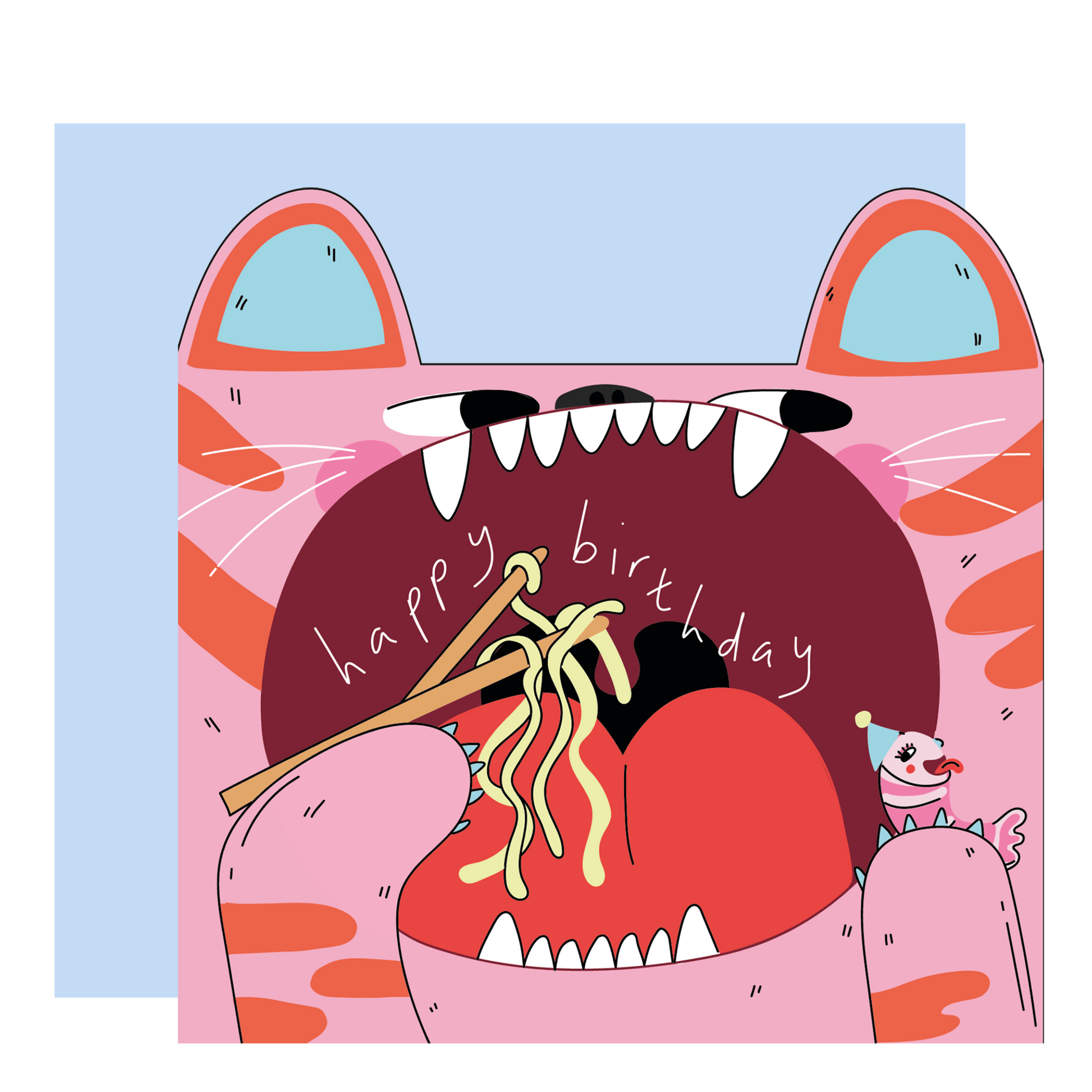 Tiger Eating noodles kids card is part of our new contemporary take on children’s greeting cards designed to stand out on the shelf and delight little ones. Each card stars a cheeky animal friend caught mid-snack — from a frog enjoying a scoop of fly-flavoured ice cream to a dog munching on crunchy hula hoops!
